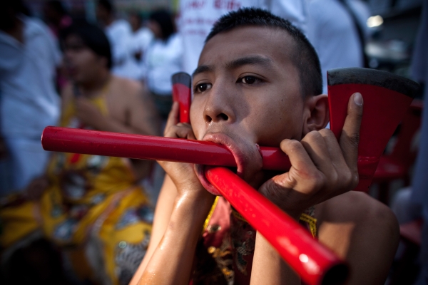 Poklonici kineskog svetišta Samkong probadali su svoje lice različitim oštrim predmetima u povorci Vegetarijanskog festivala u Tajlandu. Ritualno vegetarijanstvo na otoku Phuket potječe još od početka 19. stoljeća, a sudionici ovog festivala izvode preformanse koji uključuju piercing tijela kako bi otjerali zle duhove i zajednici donijeli sreću.