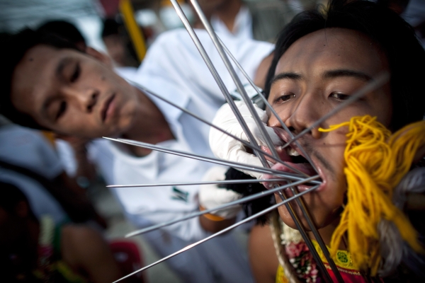 Poklonici kineskog svetišta Samkong probadali su svoje lice različitim oštrim predmetima u povorci Vegetarijanskog festivala u Tajlandu. Ritualno vegetarijanstvo na otoku Phuket potječe još od početka 19. stoljeća, a sudionici ovog festivala izvode preformanse koji uključuju piercing tijela kako bi otjerali zle duhove i zajednici donijeli sreću.