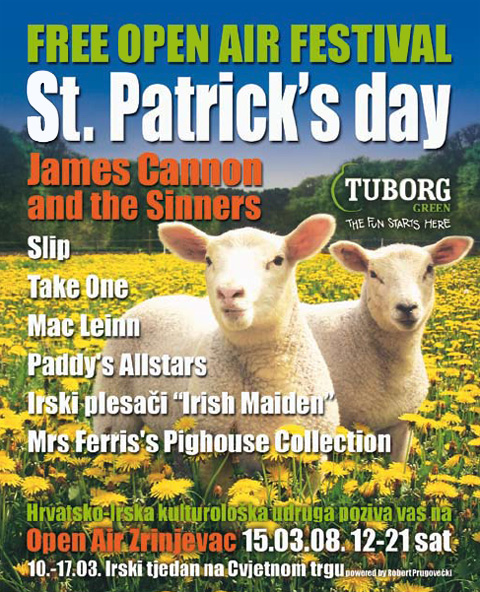 Hrvatsko – irska kulturološka udruga i ove godine organizira Free Open Air St. Patrick’s Day koncert koji će se održati 15. ožujka na Zrinjevcu, od 12 – 21 sati. Koncert je samo dio opsežnog programa Irskog tjedna u Zagrebu koji traje od 12. do 17. ožujka na Cvjetnom trgu.