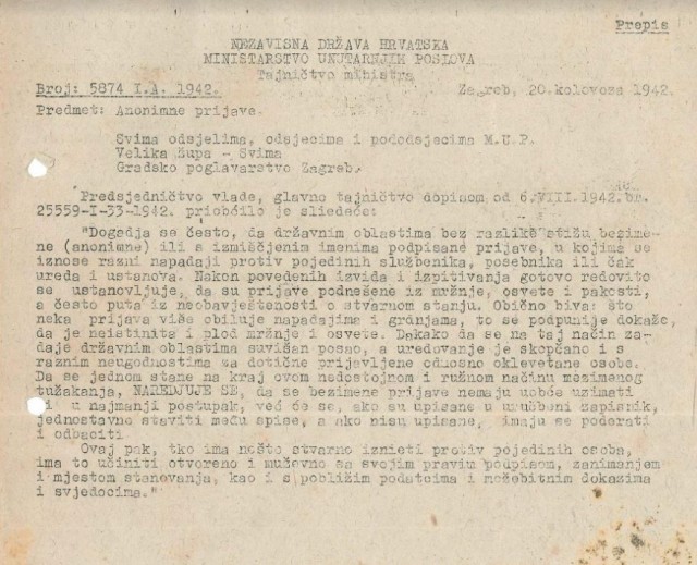 Glavno tajništvo Predsjedništva Vlade NDH uputilo je u kolovozu 1942. visokim upravnim oblastima okružnicu kojom se požalilo na učestalo slanje anonimnih prijava državnim oblastima...