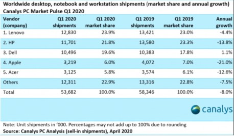 Apple je najviše pogođen u top 5 glavnih proizvođača. Prodaja računala pala im je za 21% u odnosu na prvo tromjesečje 2019. godine. HP i Acer su zabilježili pad od preko 10%, Lenovo 4,4 %, a samo je Dell uspio zabilježiti rast proizvodnje od 1,1%.
