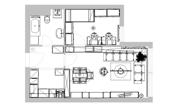 Prostor kuhinje je dovoljan da se ostvari potreban minimum funkcionalnosti, a dodatnu komociju ćete postići postavljanjem šanka koji će povećati radni prostor.  Kako bi prostor zadržao poveznicu kuhinje i dnevnog trakta, uz šank postavite i blagovaonski stol. Na taj će način veza sa kuhinjom  preko pulta biti optimalna, a stvorit će se višak prostora u dnevnom boravku za smještaj neophodnog namještaja. Predlažemo upotrebu trosjeda  na razvlačenje i dvosjeda, kako bi staklena stijena došla što više do izražaja, a transparentnost naglasite i odabirom staklenog blagovaonskog i klub stolića.