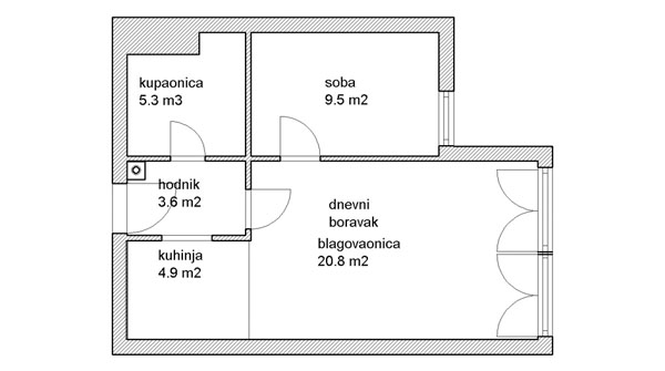 Šaljem vam tlocrt novog stana kojega je potrebno urediti za četveročlanu obitelj (dvoje ženske djece u školskoj dobi). U 45 m2 imamo jako puno potreba pa molimo za stručnu pomoć.