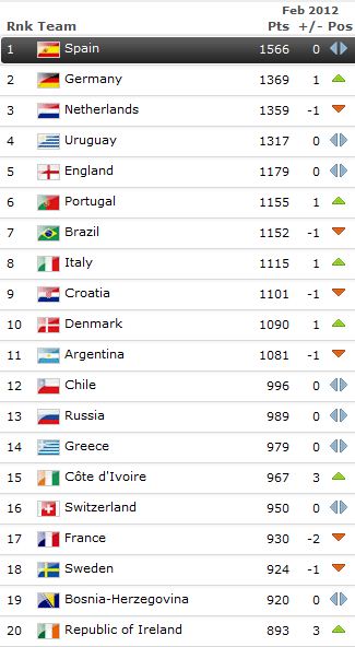 Na vrhu su i dalje svjetski i europski prvaci Španjolci sa 1.566 bodova, Njemačka je zamijenila mjesto sa Nizozemskom i sada je druga sa 1.369 bodova, dok su Nizozemci treći sa deset bodova manje. Na četvrtom mjestu je Urugvaj (1.317), a TOP pet zatvara Engleska (1.179).