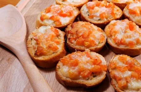 Kruh narežite na fete te zapecite (opcionalno-možete dodati i komadiće mozzarelle da se otopi na kruhu). Ovo jelo možete poslužiti odvojeno, kako bi svatko mogao dodati rajčice na svoju fetu kruha, ili ih možete odmah staviti na ispečene fetice. Preporučujemo da rajčice stavite na kruh netom pred posluživanje kako se kruh ne bi previše natopio. U slast!