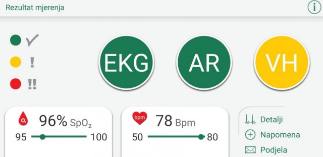 Dobiveni dijagnostički rezultati su prikazani u bojama: zelena znači da je sve u redu, crvena da postoji ozbiljan problem i hitno biste se trebali javiti kardiologu, dok žuta upozorava da postoji manje odstupanje. Pojavi li se žuto upozorenje više puta, nemojte paničariti, ali svakako trebate posjetiti liječnika opće prakse i dogovoriti da vas uputi na dodatna testiranja i pretrage kod kardiologa kako bi se utvrdila točna dijagnoza ili otklonila sumnja.