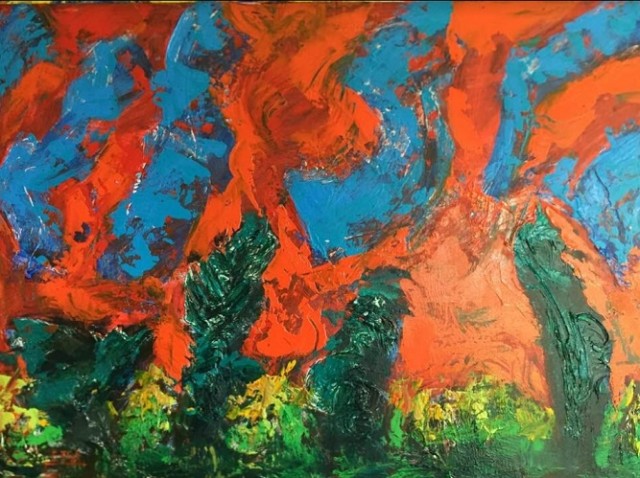 I ovom prigodom opažamo nastavak razvoja karakterističnog motiva, odnosa slojeva,igru ploha, odnosa neba i zemlje uz izrazite turbulencije u prostoru između, sve izvedeno snažnom kolorističkom gestom, u različitim kombinacijama dominantnih boja.