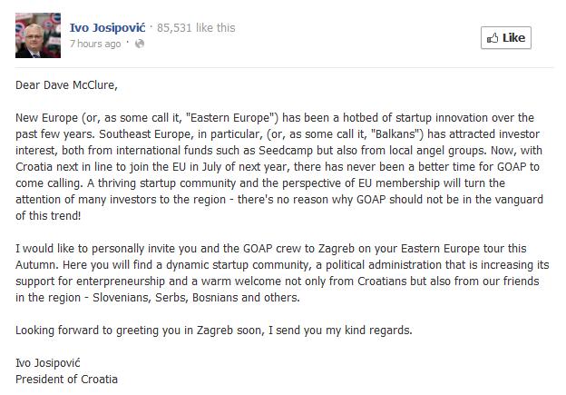 Štoviše, Dave McClure je odmah twitnuo jedan OMG, Croatian President is calling me za raju koja ga prati, no ono što je u cijeloj stvari problematično je predsjednički opis Hrvatske.