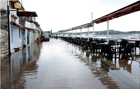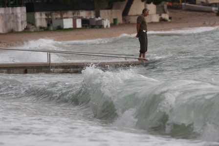 Jugo koje na makarskom području puše brzinom od 40-ak km/h jutros je prouzrocilo probleme u prometu jer trajekt na liniji Makarska - Sumartino (Brac), ne može pristati u Makarskoj zbog vjetra i visoke razine mora u luci koja se popela na 10-20 cm od korniža. Plima i jako jugo podigli su razinu mora par metara pa je u najnižem gradskom djelu Šibenika došlo do poplave.