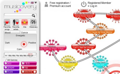 Musicovery tada kreira svojevrsno obiteljsko stablo s pjesmama koje su idealne za vaše trenutno raspoloženje. Pjesme koje vam se nikako ne sviđaju možete ponovno obrisati, a ukoliko se registrirate na stranicu možete besplatno prebacivati s jedne pjesme na drugu.
