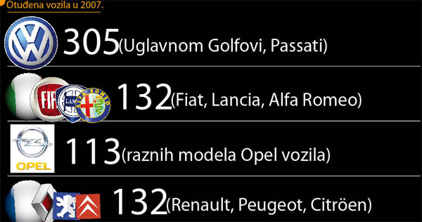Najatraktivniji su za lopove bili modeli iz proizvodnog programa Volkswagena, i to uglavnom Golfovi i Passati, kojih je tijekom prošle godine u Hrvatskoj ukupno otuđeno 305 komada. Na drugom mjestu te svojevrsne lopovske top-liste sa 132 ukradena su talijanske marke Fiat, Lancia i Alfa Romeo.