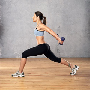 Stanite razdvojenih nogu u širini kukova i napravite velik korak naprijed lijevom nogom. Savinite koljeno sve dok ne dođe točno iznad članka, a bedro bude paralelno s podom. Vaša stražnja noga treba biti ravna, peta uzdignuta od podloge. Pritisnite utege unatrag iza sebe što dalje možete i zadržite ravne ruke. Ostanite u tom položaju sve dok ne završite cijeli pritisak tricepsa. Ponovite s drugom nogom.