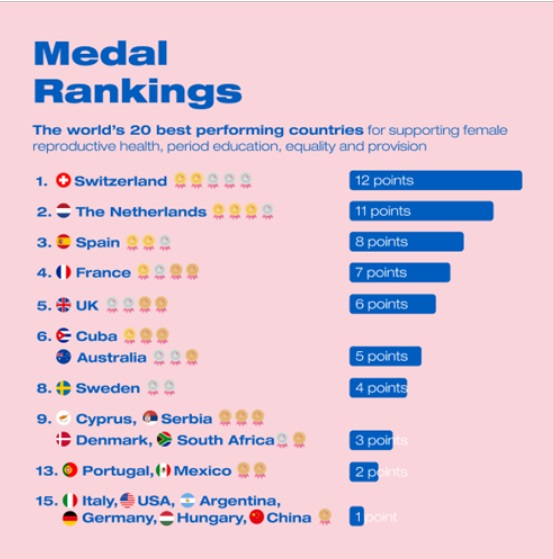 Na vrhu tablice je Švicarska koja je - zahvaljujući svojim kulturološkim stavovima otvorenosti i pristupačnosti u sferama kontracepcije, javnog zdravstva, progresivnim standardima na radnom mjestu i sveobuhvatnom obrazovanju (i među djevojčicama i među dječacima), zaradila dva zlata i tri srebrne menstrualne medalje.