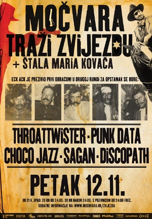 Nakon medijskog i, puno bitnije, glazbenog uspjeha prve natjecateljske večeri programa "Močvara traži zvijezdu" u kojoj je nastupilo pet bendova nastavlja se dalje u žestokom tonu. Komisija sastavljena od šačice Močvaraca koji su bili prisiljeni preslušati materijale stotinjak prijavljenih demo bendova morala je uzeti bolovanje izazvano zujanjem u ušima, no sve žrtve će im se jednog dana isplatiti kada će s ponosom moći pričati svojim unucima kako su upravo oni doprinjeli usponu alternativne mjuze u Hrvata i okolnih naroda. Budite i vi dio te povijesti, dođite podržati one koje se uspinju i ove večeri u vaš najdraži klub!!!