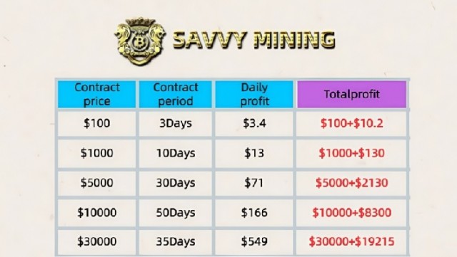 SAVVY MINING is a smart crypto mining platform suitable for all users. Whether you have a technical background or a lot of money, you can easily participate in mining and get stable daily returns. The platform is easy to operate without any hidden fees or complex requirements.