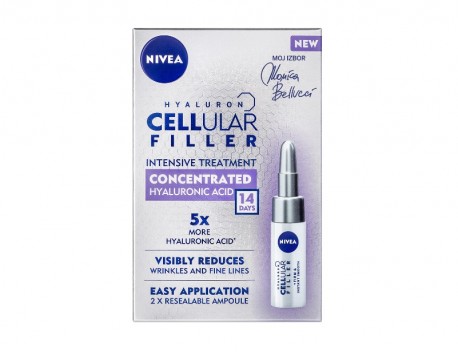 Zahvaljujući inovativnoj formuli NIVEA Hyaluron CELLular Filler 14-dnevni tretman sadrži čak 5 puta više hijaluronske kiseline, što ga čini proizvodom s najvišom koncentracijom hijalurona od svih NIVEA proizvoda za njegu lica. Intenzivni tretman moćan je saveznik u održavanju mladenačkog izgleda lica koji će pomoći stanicama vaše kože da se ponovno aktiviraju. Pokretanjem stanične aktivnosti koža postaje hidratizirana i dubinski njegovana. Tako su godine samo broj kada se mladost oduvijek nalazi u vašoj koži.