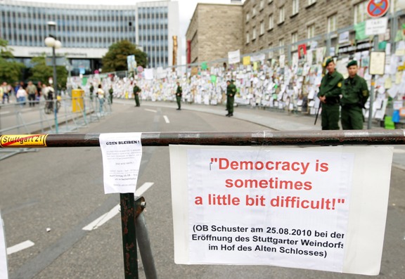 Između 20.000 i 30.000 ljudi prosvjedovalo je u petak navečer pod jakom kišom protiv pokretanja divovskog urbanog projekta u Stuttgartu. Prije tjedan dana, oko 30.000 ljudi sudjelovalo je u sličnom prosvjedu pred glavnim kolodvorom koji bi trebao biti srušen kako bi se omogućila modernizacija željezničkih linija u regiji.