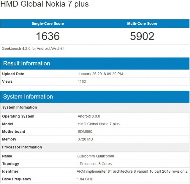 Nokia 7 Plus sa Snapdragon 660 u Geekbenchu