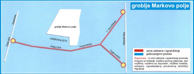 U petak, 29. 10. 2010. i subotu, 30.10.2010 od 07.30 do 20.00 sati i utorak, 02. 11. 2010., od 09.00 do 20.00 sati, biti će na snazi zabrana prometa u Aleji H.Bollea, te Mirogojskom, od rotora do Remetske ceste.