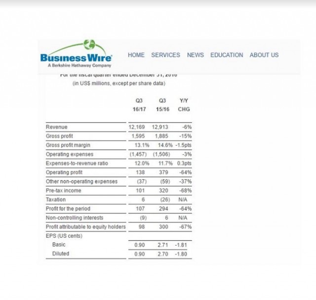 Zarada tvrtke Lenovo od prodaje PC računala i mobilnih uređaja u trećem kvartalu 2016-2017 fiskalne godine je tržišnih očekivanja. Kvartalni prihod iznosio je 12,2 milijarde dolara ili 6 posto manje u odnosu na godinu dana ranije. Neto dobit je 98 milijuna dolara što ukazuje na pad 67 posto u odnosu na proteklu godinu i 37 posto u odnosu na prethodni kvartal.