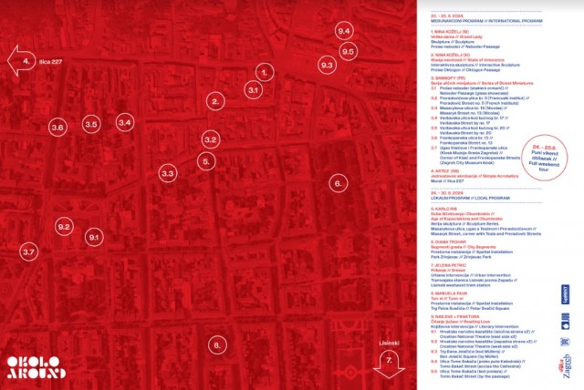 U sklopu ovogodišnjeg projekta „Okolo" na zagrebačkim ulicama niknule su nove prostorne instalacije s potpisom hrvatskih umjetnika Diane Trohar, Karla Risa i Manuele Pauk, urbana intervencija Jelene Petric te književna intervencija Nas dve+Fraktura. Nakon prethodno predstavljenih skulptura slovenske umjetnice Nine Koželj, serije uličnih minijatura Samsofyja iz Francuske i murala beogradskog uličnog umjetnika Arteza, na mapu lokacija upisalo se njih još 11 koje možete obići sve do 30. kolovoza.