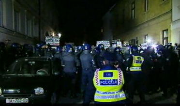 Nakon toga, prosvjednici su iščupali prometne znakove pokušavši njima probiti policijske ograde, no specijalci su pod punom spremom uletjeli među prosvjednike, počeli mlatiti palicama i špricati suzavcem, tako da su neki morali potražiti pomoć kod stanara.