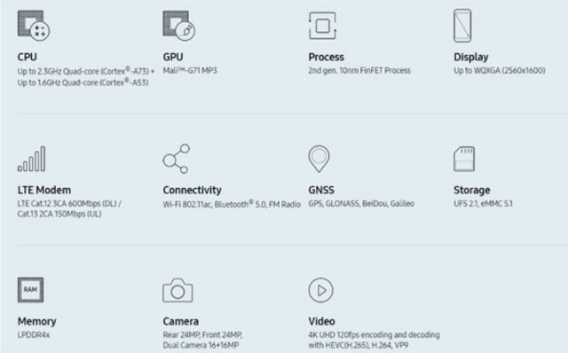 Exynos 7 Series 9610 integrira četiri Cortex A73 jezgre na 2.3 GHz i četiri A53 jezgre na 1.6 GHz te GPU G72 MP3 Mali.