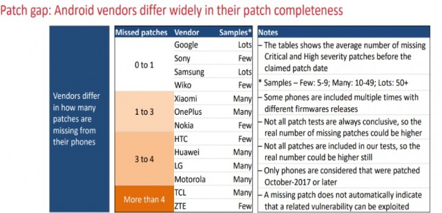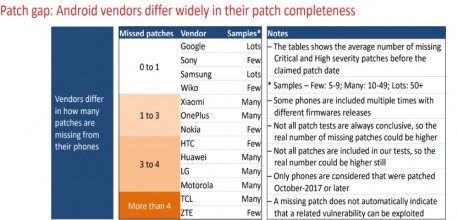 Istraživački tim Security Research Labs, proučio je firmware 1.200 Android pametnih telefona od 10 različitih proizvođača i sve Google sigurnosne zakrpe sustava izdane tijekom 2017. godine. Tvrde da gotovo svi proizvođači varaju korisnike oko sigurnosnih nadogradnji.
