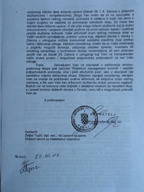 sustava intelektualnog vlasništva u RH, no to je bio dokument koji nije nikada poštovao, što je dokazivo svojim ignoriranjem prava javne posudbe, novog prava značajnog za književnike, zbog čega ih je financijski nepopravljivo oštetio. Naveo je da je bio nacionalni koordinator za intelektualno vlasništvo u procesu pristupa EU, no to je bio prof. Siniša Petrović s Pravnog fakulteta u Zagrebu. Naveo je da je hrvatski patentni i žigovni zastupnik, no to svojstvo mu je dala njegova zamjenica