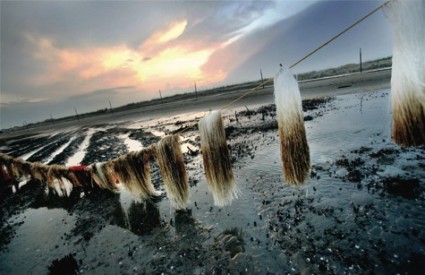 Upijajući materijali koji su korišteni za upijanje nafte stoje obješeni na obali otoka Elmer.