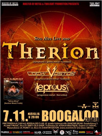 Tri godine nakon "Gothic Kabbalah" albuma, švedska symphonic/gothic metal atrakcija Therion vraća se 7. studenog u zagrebački Boogaloo sa novim remek djelom "Sitra Ahra", svojim 14 albumom koji sadrži 11 novih pjesama u svoj glazbenoj virtuoznosti Theriona koje će vas odvesti na putovanje kroz misticizam.