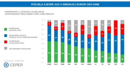 CEPER je pronašao podjelu između sjevera i juga po pitanju Kine. Postoji 6 srednjoistočnoeuropskih (uglavnom južnih) zemalja u kojima relativna većina javnosti podržava jačanje gospodarskih odnosa s Kinom, dok u još 3 regionalne (uglavnom sjeverne) zemlje relativna većina podržava zadržavanje gospodarskih odnosa na sadašnjoj razini.