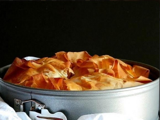 U posudu za pečenje posložite jedan list tijesta premazan maslinovim uljem. Paziti pri tom da tijesto ide preko ruba kalupa.