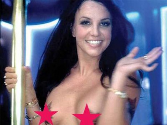 Slike pjevačice koja neuspješno pokriva gornji dio tijela navodno su iz spota za pjesmu "Gimme More" s albuma "Blackout". Na njima kontroverzna Amerikanka pleše oko šipke poput zabavljačice. Iako je u toplessu tijelo joj je prektiveno lažnim tetovažama, a kosa obojena u crno.