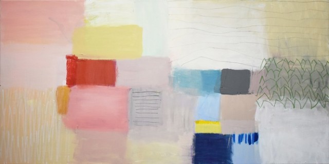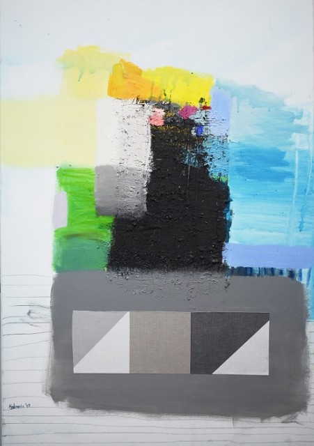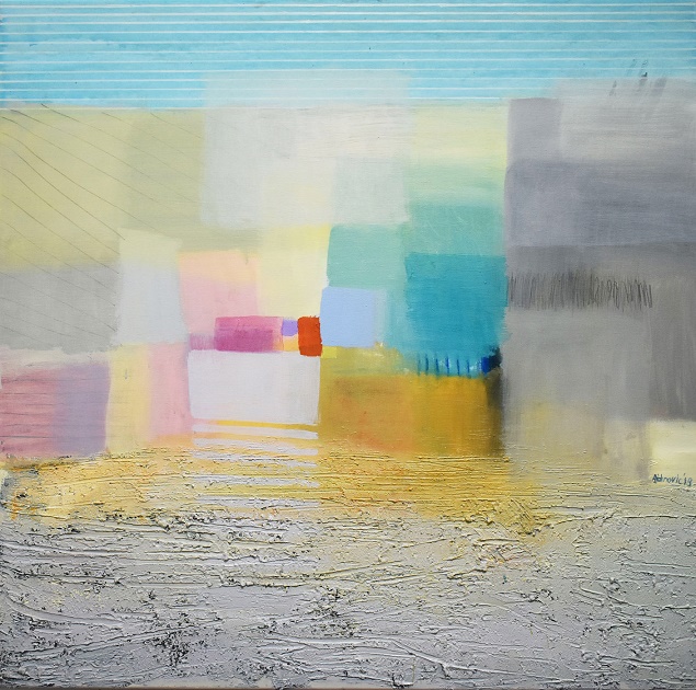 Ajdinovićev svijet čine obojane plohe fine, delikatne palete, vijugavi pravci koji se probijaju između tih neobičnih oblika ili ih čak spajaju u jedinstvenije cjeline