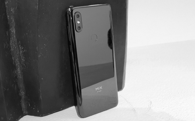 U gornjem lijevom kutu stražnje strane dvije su kamere i dvojna LED bljeskalica. Niže je okrugli skener otiska prsta s plitkim područjem dodirne površine. Očitava otisak iz bilo kojeg kuta gotovo trenutno. Osim toga Mi Mix 3 nudi standardnu metodu prepoznavanja lica. Dobro i brzo radi ako ima dovoljno svjetla u okolini. Slogan izvornog "MI MIX DIZAJNA XIAO MI" sveden je na "MIX BY XIAO MI".