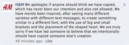 „Ispričavamo se ukoliko smatrate da smo nešto kopirali od vas, to nikad nije bila naša namjera, niti to dopuštamo u našoj tvrtki. Radi se isključivo o tome da su naši dizajneri bili inspirirani tim tekstom te su odlučili stvoriti nešto slično tomu, igrajući se velikim i malim slovima te znakom u obliku srca. Iznimno nam je žao ukoliko je itko pomislio kako bismo mi namjerno kopirali nečije djelo."