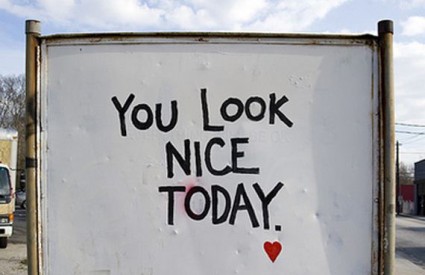 „14. prosinca 2008. godine dizajnirala sam znak na kojem je pisalo „You Look Nice Today" (Izgledate lijepo danas) i postavila sam ga u ulicu na ulazu u grad, kako bi se moji dragi susjedi osjećali malo bolje svaki put kad ga ugledaju. Osjećala sam da je to najmanje što mogu učiniti za svoje susjedstvo", objašnjava Tori.