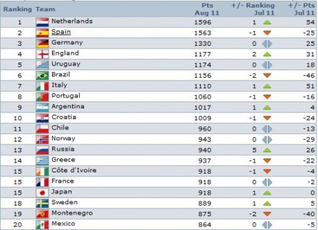 Iako je prijateljska utakmica s Engleskom bila otkazana zbog nemira u Londonu, Nizozemska je zauzela prvo mjesto na FIFA-inoj ljestvici nakon što je Španjolska poražena od Italije u prijateljskom susretu.