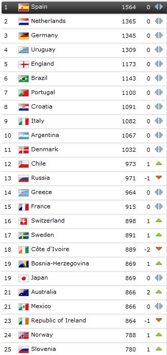 Među prvih deset reprezentacija nema nikakvih promjena. Iza vodeće Španjolske je Nizozemska (1365), treća je Njemačka (1345), četvrti Urugvaj (1309), a peta Engleska (1173).
