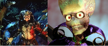 Brojni su filmski vanzemaljci pokušali opustošiti Zemlju, ali čini se da su Marsijanci u tome najviše uživali. Predator (lijevo), Marsijanci (desno):